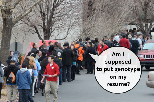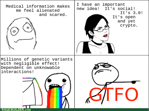 The downside to “consumer as guinea pig” is that the free marketplace is full of liars and exploiters, and will soon be awash in every sort of hokey “geno-” this and “geno-” and “g’s” fused with all sorts of words that begin with “en”. I mean, have you ever not been paralyzed in the salad dressing aisle? Do we really need “specially formulated for rs1234567 AA” geno-dressings?