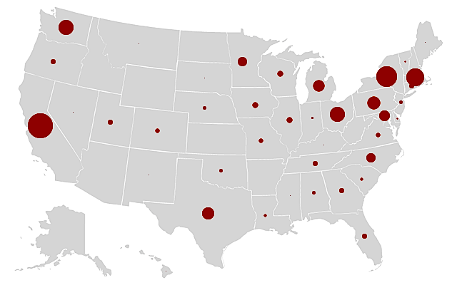 Having some fun here learning to visualize data using Processing. Here is a map showing the relative number of genetic testing laboratories. California is listed with the most (35 labs). *Note, these are genetic testing laboratories which may service a wide range of health care providers and clinics.